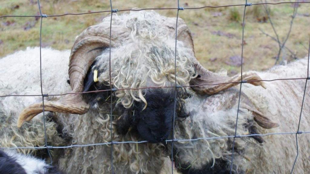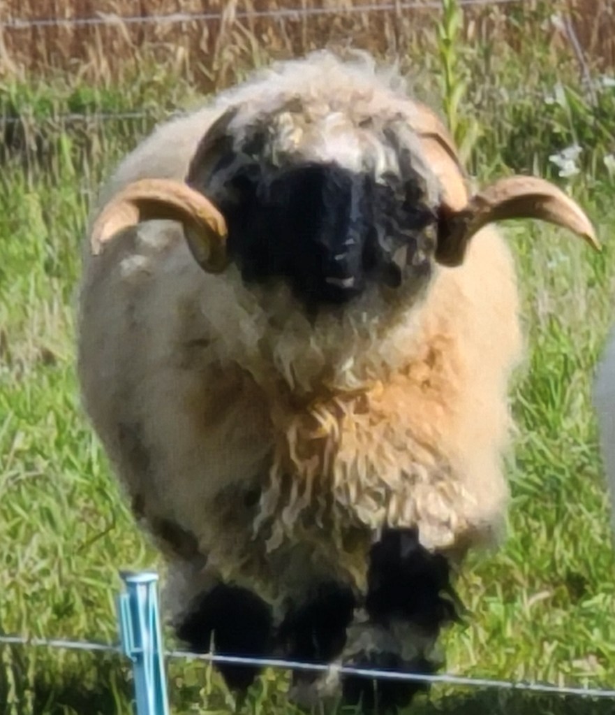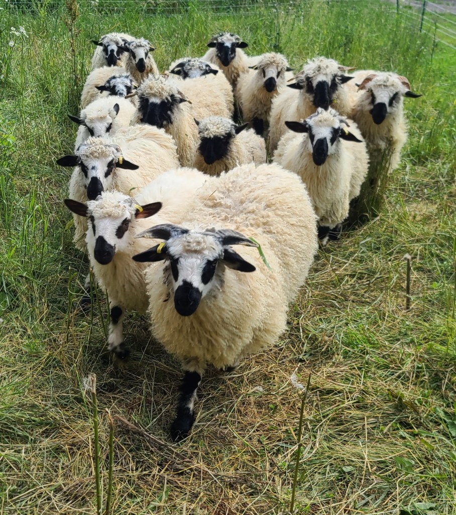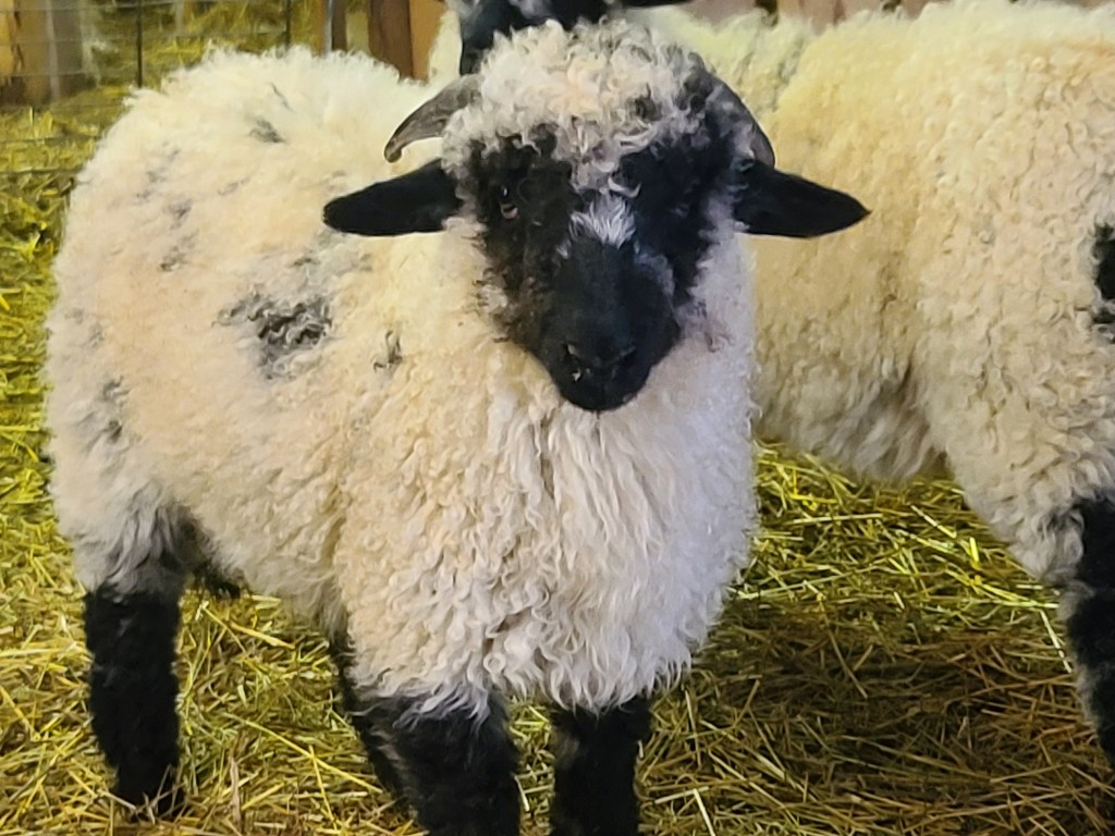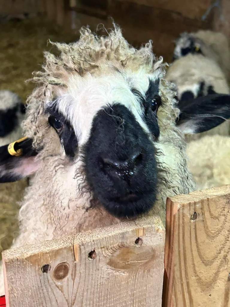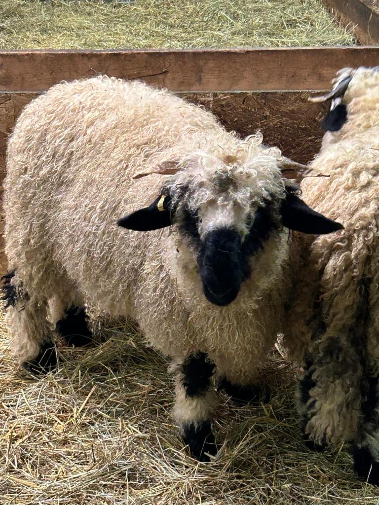 We can’t say enough about this ram he has a calm gentle demeanour . He has coincided very happily with our four wether teaser rams. He throws beautifully marked and correct lambs as you can see from the picture of his 2023 lambs. Given that they are F1s and several F2s their markings are amazing. Many of them even have the black knee and hocks and the black masked faces true to the valais breed, along with beautiful Valais fleece.