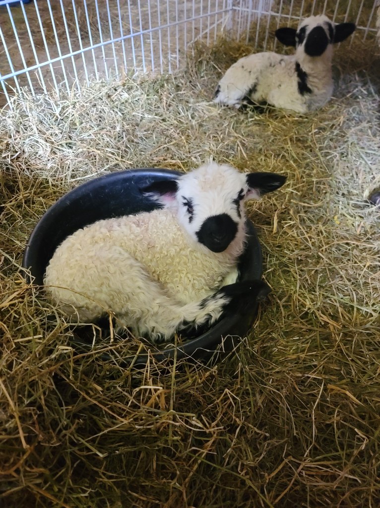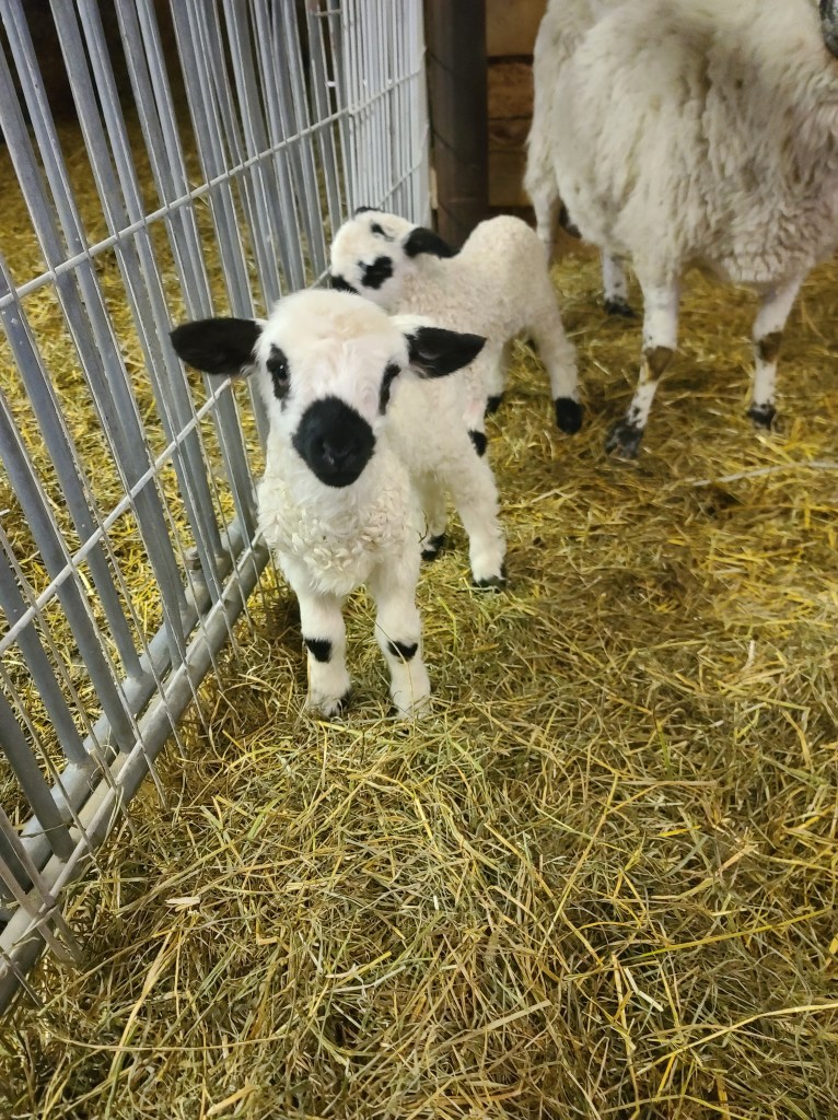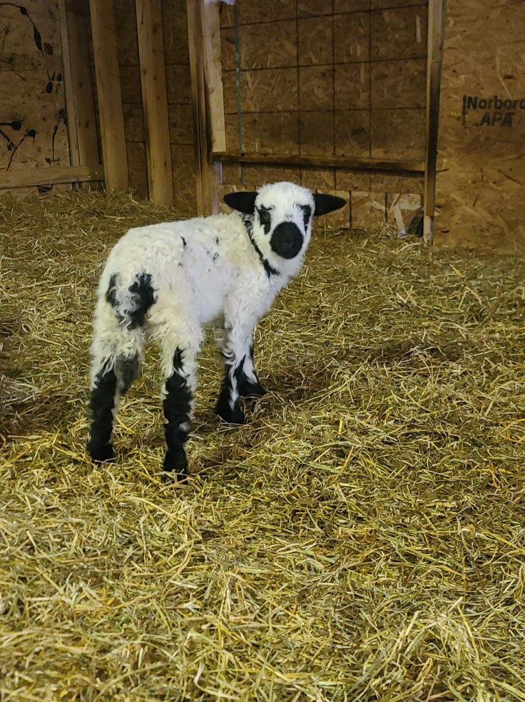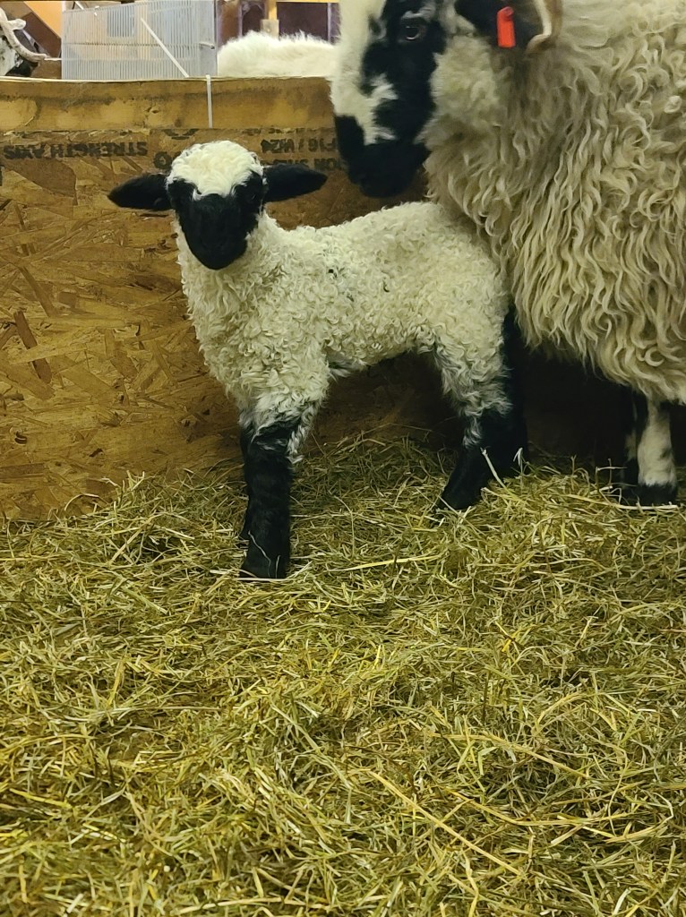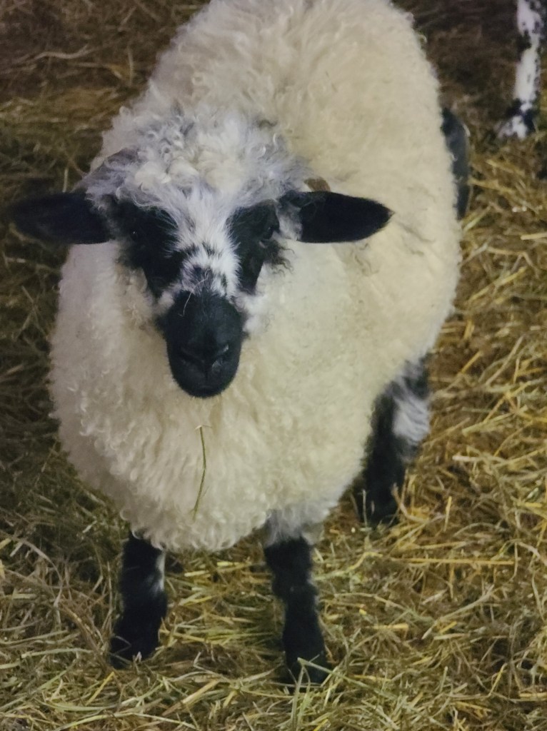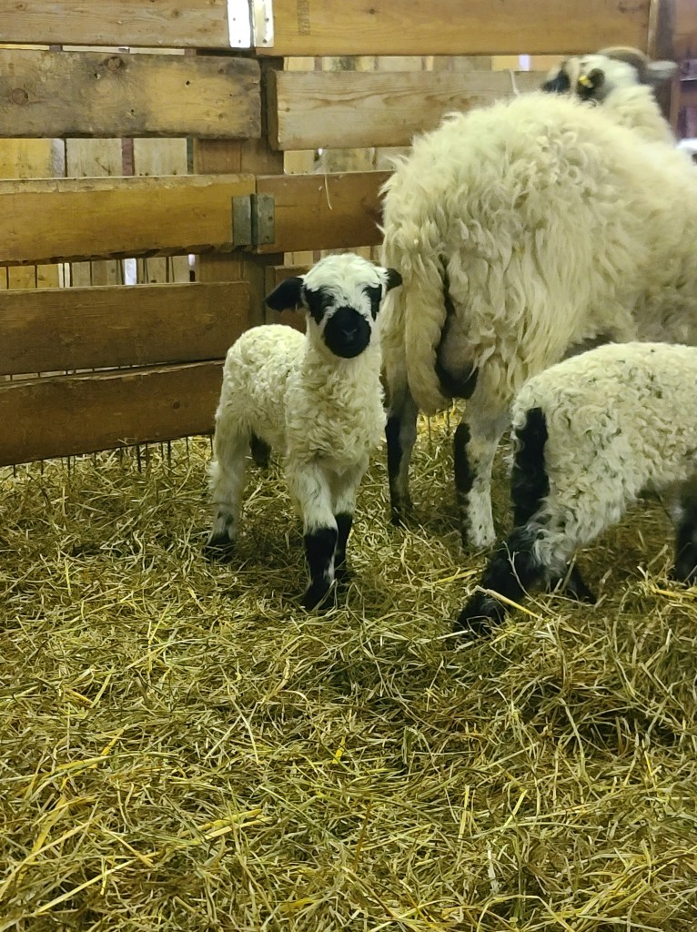 We can’t say enough about this ram he has a calm gentle demeanour . He has coincided very happily with our four wether teaser rams. He throws beautifully marked and correct lambs as you can see from the picture of his 2023 lambs. Given that they are F1s and several F2s their markings are amazing. Many of them even have the black knee and hocks and the black masked faces true to the valais breed, along with beautiful Valais fleece.